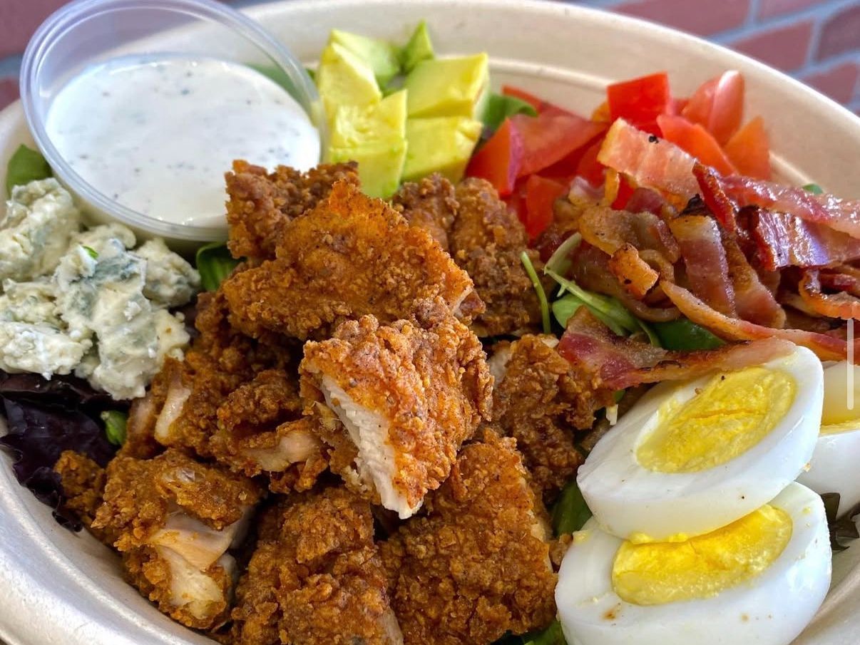 tomato, bacon, farm egg, avocado, blue cheese, corn, honey mustard